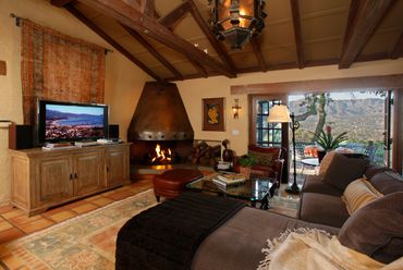 Inside, the open-concept living space exudes adobe charm - with a hooded gas fireplace, beamed ceilings, Saltillo tile floors and a sectional with plenty of soft blankets and pillows for curling up by the fire. French doors lead to the terrace which open wide for indoor/outdoor living.